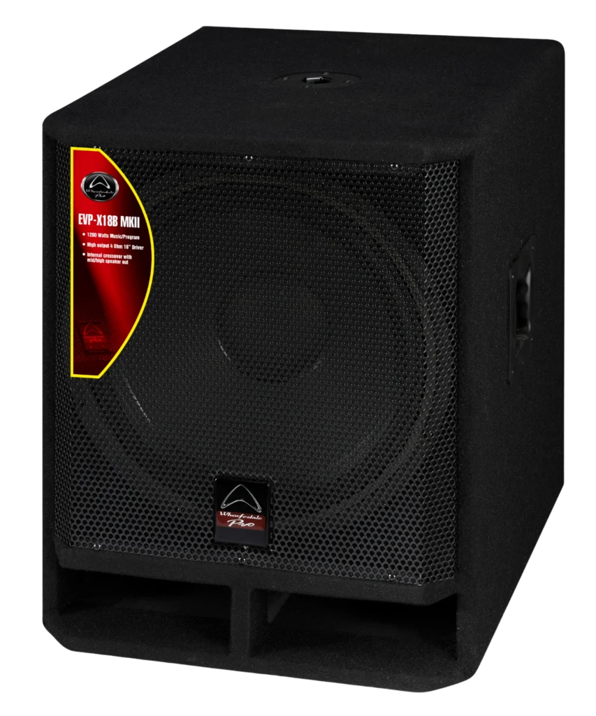 EVP-X18B MKII is an 18″ passive subwoofer from our EVP-X MKII Series — engineered for powerful low-frequency reinforcement in live performance, DJ, and portable PA environments. At its core is a custom Wharfedale Pro 18″ LF driver with a robust 3.0″ voice coil, delivering deep, authoritative bass with reliability and control. Rated at 600 W AES (1200 W programme / 2400 W peak) and capable of producing up to 134 dB max SPL @ 1 m, EVP-X18B MKII provides serious low-end extension to complement full-range EVP-X tops or other compatible PA speakers. Designed for real-world durability, the cabinet is finished in a rugged carpet covering with a steel front grille for driver protection.